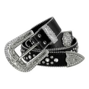 Black Leather Belt And Black Buckle Studded with Black Rhinestones