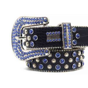 Black Strap With Blue Diamond Silver Studded Rhinestone Belt