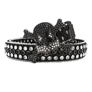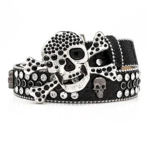 Skull Buckle Black Strap Belt with Black and White Studded Rhinestones