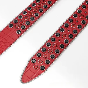 Skull Buckle Red Strap Belt with Black and Red Studded Rhinestones