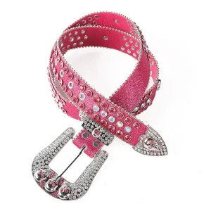 Skull Buckle Pink Shiny Strap Belt with Crystal Studded Rhinestones