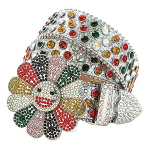 Flower Buckle Silver Strap Belt with Multi-Color Studded Rhinestones