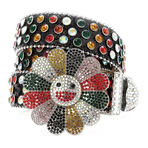 Flower Buckle Black Strap Belt with Multi-Color Studded Rhinestones