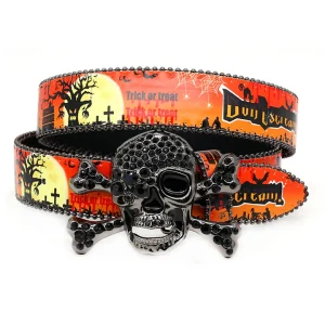 Skull Buckle Orange Strap Halloween Belt with Rhinestones