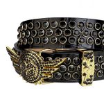 This Unisex Fashion Alligator Black Leather Belt is the perfect addition to any outfit. The black rhinestones on the belt and buckle add a touch of glamour and shine. The gold wings shaped buckle is a unique and trendy addition to the design, perfect for those who want to stay on-trend. The black rhinestones on the buckle complement the ones on the belt, creating a cohesive and stylish look. This belt is great for both men and women and is perfect for adding some diamond bling to your hip hop look.