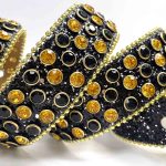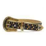 Upgrade your fashion game with the Unisex Fashion Alligator Black Leather Belt from Rhinestone Belt Store. This belt features a black alligator texture and is adorned with gold and black rhinestones, making it a statement piece that adds a touch of glamour and bling to any outfit. The gold buckle of the belt is also decorated with gold and black rhinestones, creating a cohesive and polished look that’s perfect for hip hop enthusiasts and anyone who wants to add some sparkle to their style.