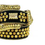 The gold studs and rhinestones catch the light, creating a dazzling effect that adds a touch of sophistication to the belt. The black strap with gold studded BB rhinestone belt is perfect for adding a statement piece to jeans, skirts, or dresses, making it a versatile addition to any wardrobe.