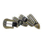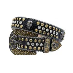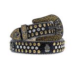 The black leather belt is made of high-quality alligator skin, making it durable and long-lasting. The gold and white rhinestones are arranged in an eye-catching pattern, adding some sparkle and shine to the belt. The buckle features a unique skull design, giving it an edgy and bold look that’s sure to turn heads.