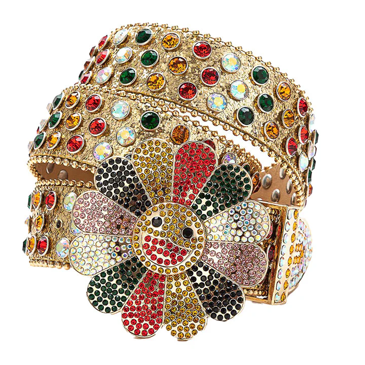 Flower Buckle Gold Strap Belt with Multi-Color Studded Rhinestones