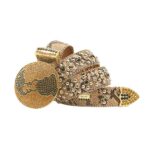 The combination of the opulent gold-plated buckle and the intricate studded rhinestones creates a striking contrast against the sleek gold strap, making it a statement piece that will catch everyone’s attention. The belt is designed to be adjustable, providing a comfortable and customized fit for various waist sizes.