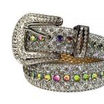 Add some bling to your wardrobe with the Unisex Fashion Alligator Silver Leather Belt from Rhinestone Belt Store. This stunning belt features a silver alligator texture and is adorned with multi-color rhinestones, adding a touch of glamour and sophistication to your look. The silver buckle of the belt is also decorated with multi-color rhinestones, creating a cohesive and polished look that’s perfect for hip hop enthusiasts and anyone who wants to make a statement.